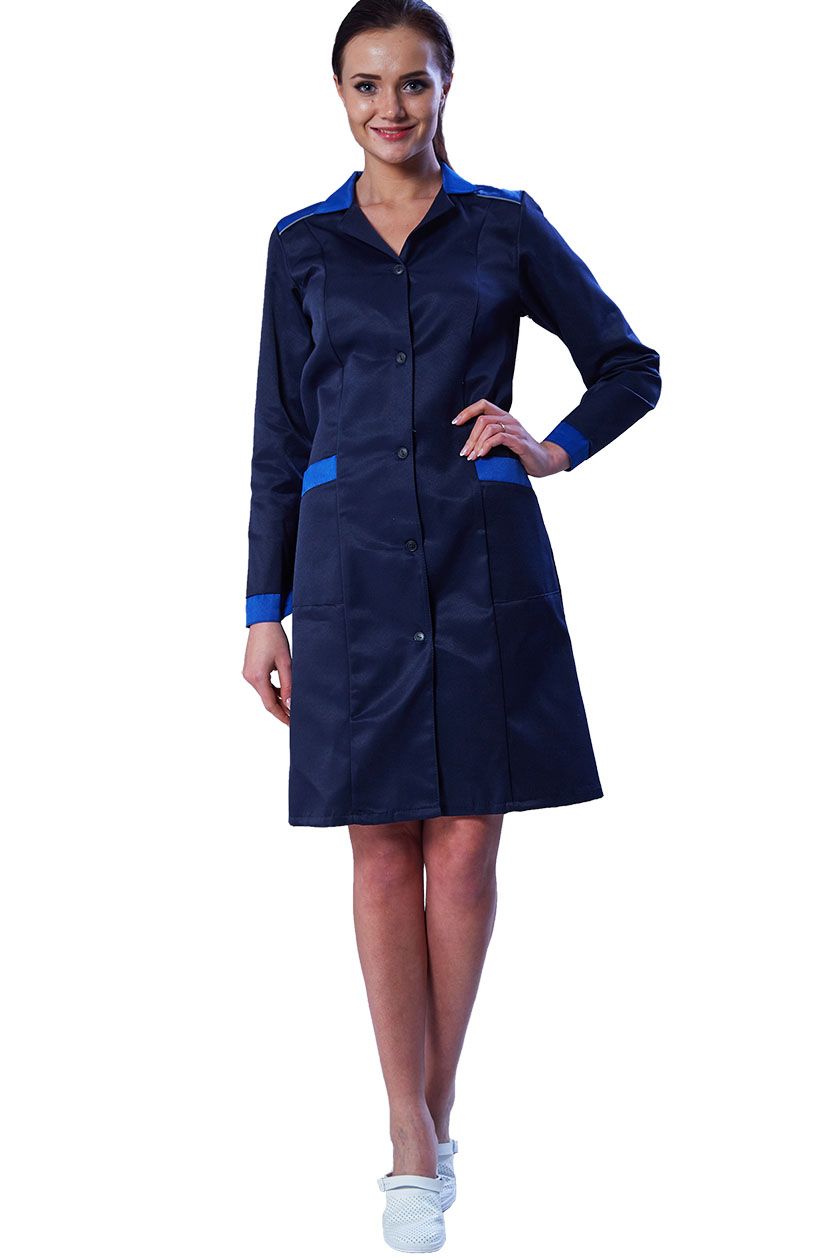 Халат с центральной бортовой застежкой на петли и пуговицы, со смещенным плечевым швом, воротник отложной. Полочки с вертикальными рельефами, с двумя нижними накладными карманами с наклонным входом. Боковые срезы карманов входят в боковые и рельефные швы.